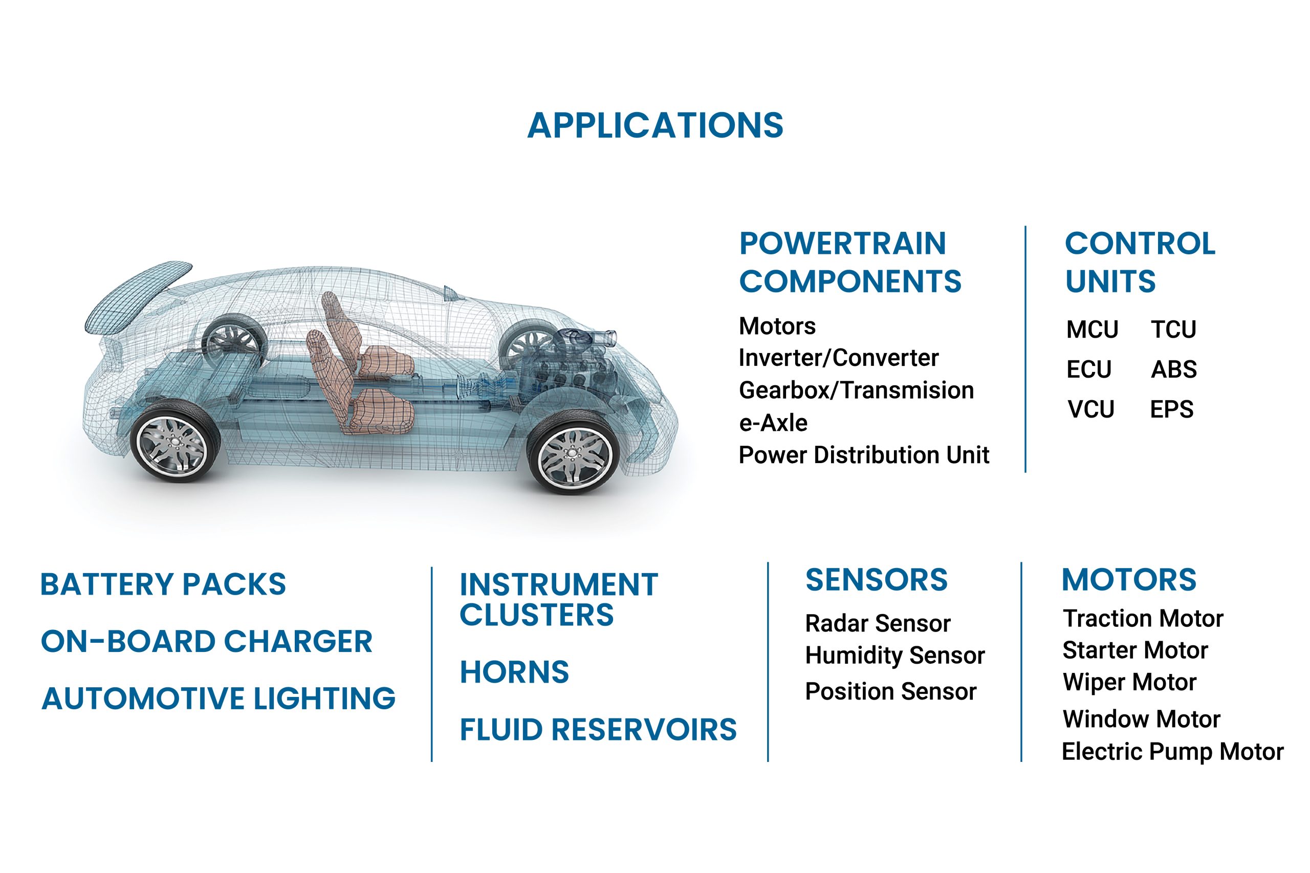 Protect sensitive devices such as sensors, ECUs, battery packs, and powertrain electronics from damage caused by moisture, particles, and liquids.